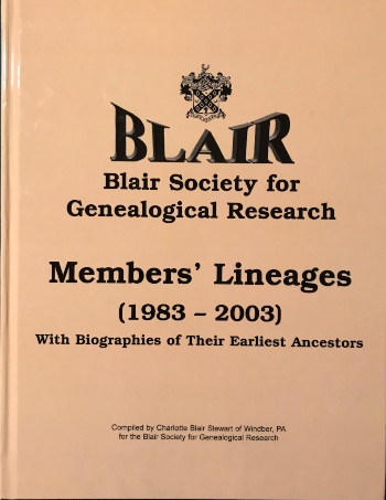 This publication was compiled by Charlotte Blair Stewart (BSGR Genealogist). It contains the most recent extensions and/or revisions of the lineages of all BSGR members (about 1100 strong, past and present), with a geographical place index and an every name index in 598 pages (8 1/2 x 11 format).